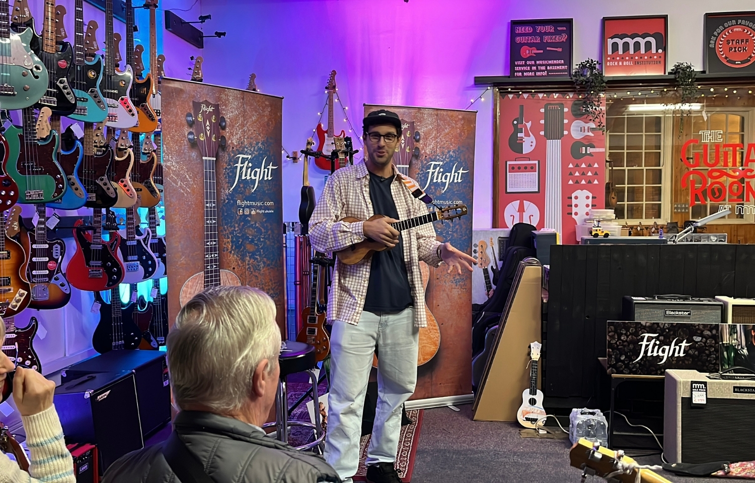 The first event took place at Southern Ukulele Store in Bournemouth, where Vasko led a lively Ukulele Groove Workshop as part of the store’s “Ukulele Takeover” day. The event also featured a performance by fellow Flight artist Julia Traser, adding extra musical flair and drawing a great crowd. Attendees enjoyed a full day of ukulele activities and had the chance to try a variety of Flight models throughout the event.