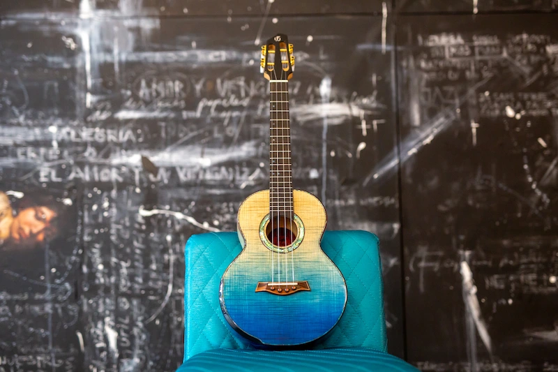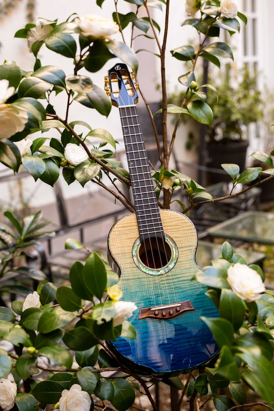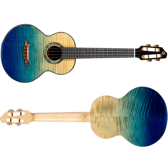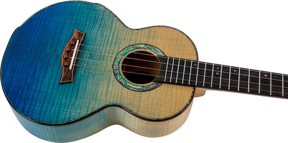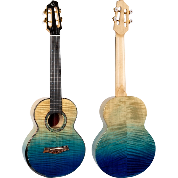 The A10 FM Faded Blue Tenor Ukulele features stunning solid flamed maple for the body of the instrument–resulting in a ukulele that is as stunning to look at as much as it is beautiful to hear. The body is amazing as it fades from natural flamed maple to blue. Each ukulele in our A10 series is handcrafted by a single master luthier.
