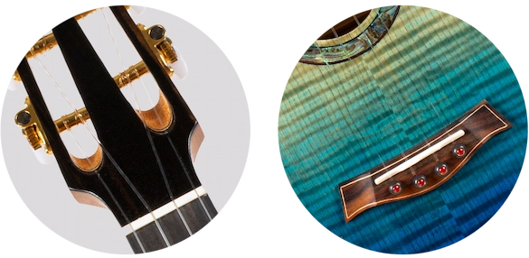 The A10 Series features an ebony bridge (matching the fretboard), as well as a real bone nut and a compensated saddle. Compensated saddles help to properly set the intonation of each string. The A10 series uses a pin bridge system, which helps keep the strings properly aligned on the ukulele, as well as to create a break angle over the saddle that transfers vibrations efficiently to the soundboard of the ukulele.
