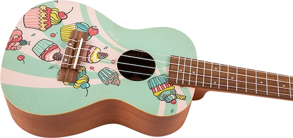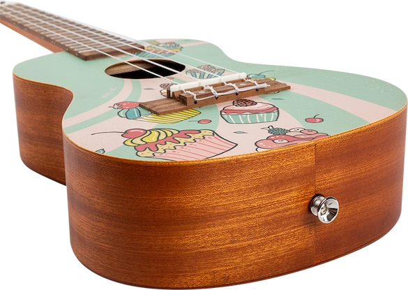Concert ukulele with a laminate spruce top and laminate mahogany back and sides featuring a cupcake inspired design on the soundboard