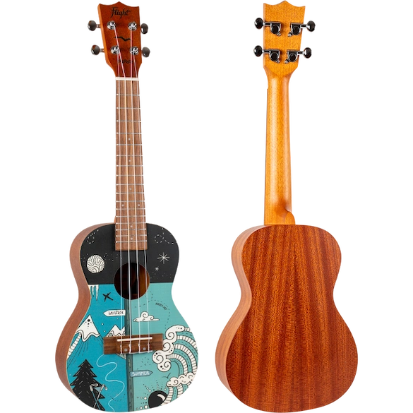 The Flight AUC-33 Two Season Concert Ukulele whimsically celebrates two seasons from Slovenia (the home of Flight Ukulele) with a wonderful design by the talented Argentinian artist, Macuco.art! Summer is a time for travel, camping, swimming, hiking, and warm outdoor fun. We appreciate the warm sun and good times that summer brings. Winter offers thrilling activities such as skiing, sledding, ice skating, and snowmobiling. While sometimes it is bone-chilling cold, the winter gives us time to enjoy a warm beverage, keep warm with a blanket, and enjoy the company of others while the weather is frightful outside. AUC-33 Two Season Concert Ukulele is the perfect instrument for any season!