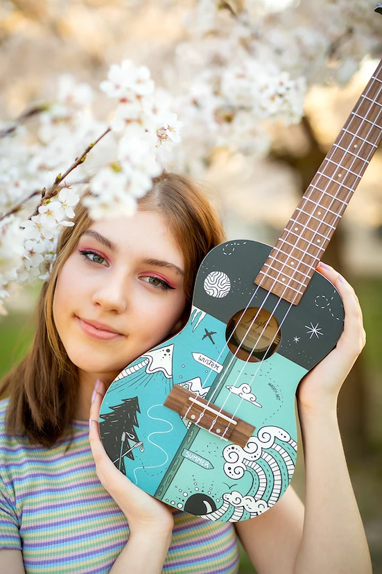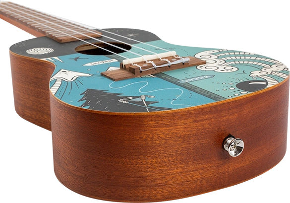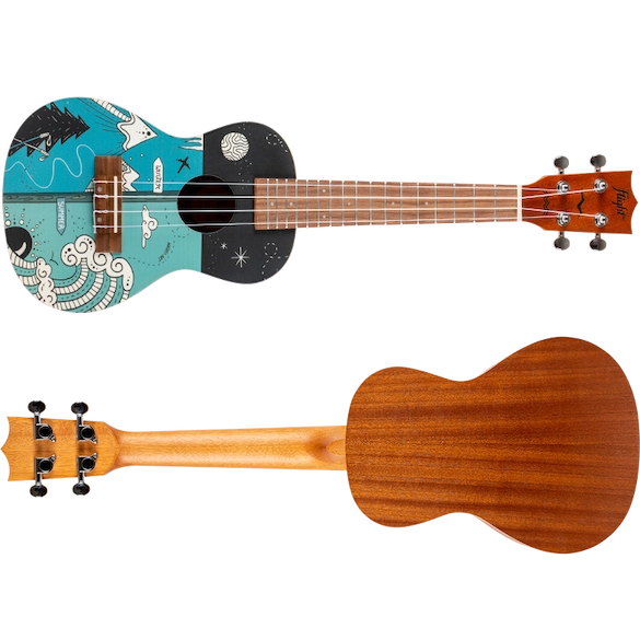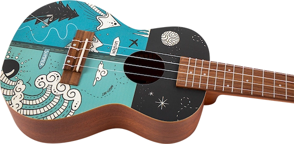 At its heart, the AUC-33 Two Season Ukulele is an excellent ukulele with a laminate spruce top and laminate mahogany back and sides, but it features a design twist: it features amazing artwork on the soundboard. There have been no shortcuts taken with the design of these instruments–they sound and play as good as they look.
