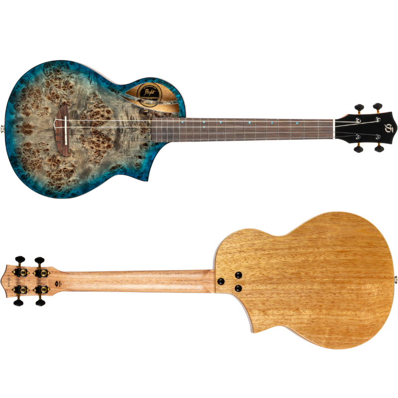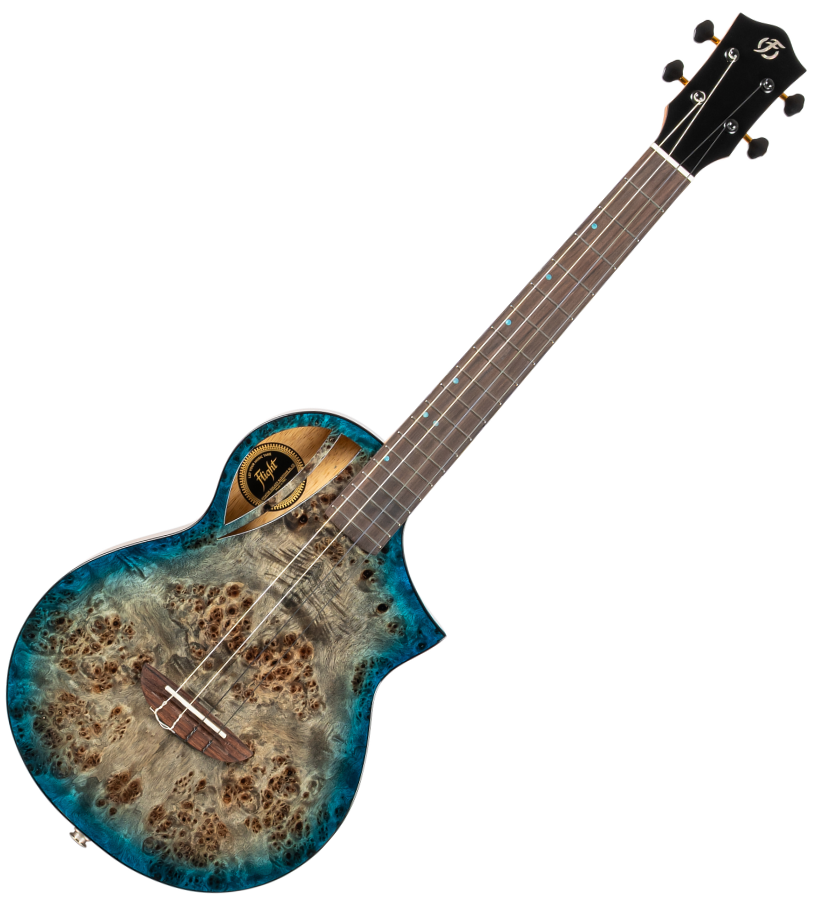 Premium Features: Solid Poplar top, Solid Mango back and sides, Flight Aviator custom design and shape, black and gold machine heads, Offset blue dot position markers, black binding.