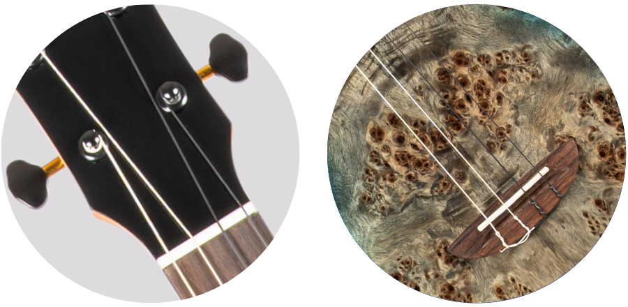 The Flight Aviator Galaxy comes with a bone nut and compensated saddle, allowing for vibrations to efficiently transfer from the string to the soundboard.