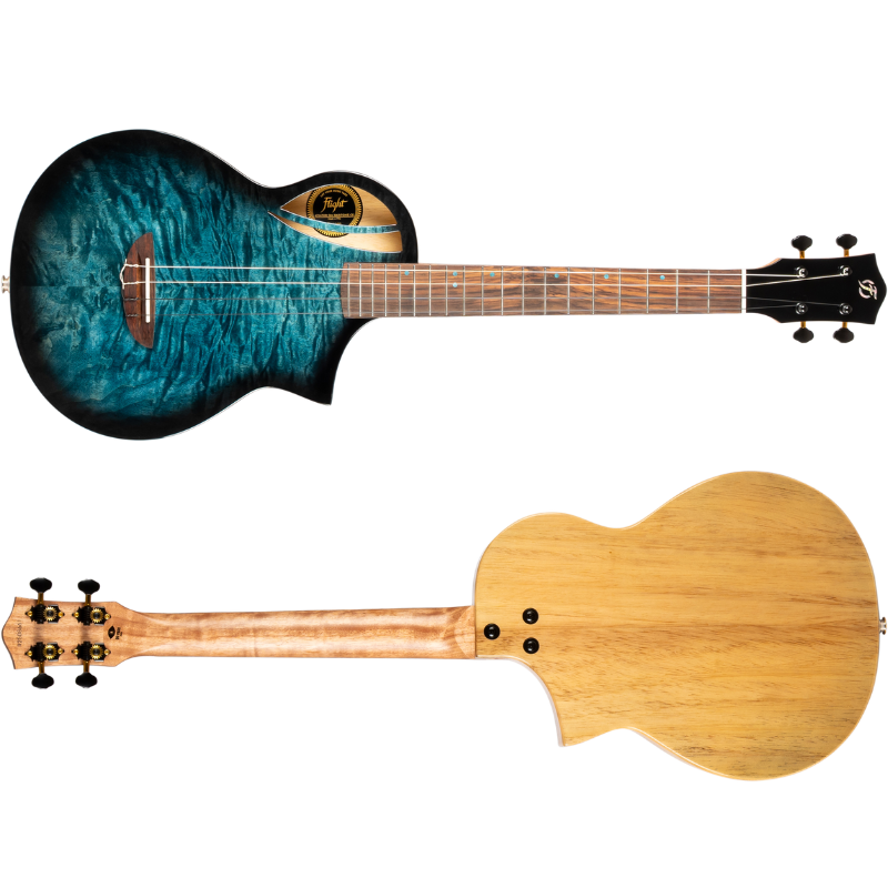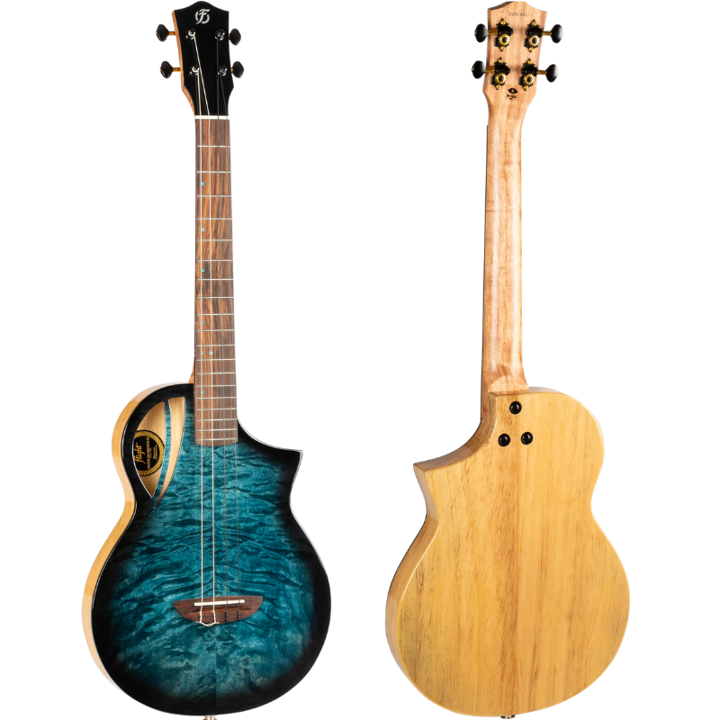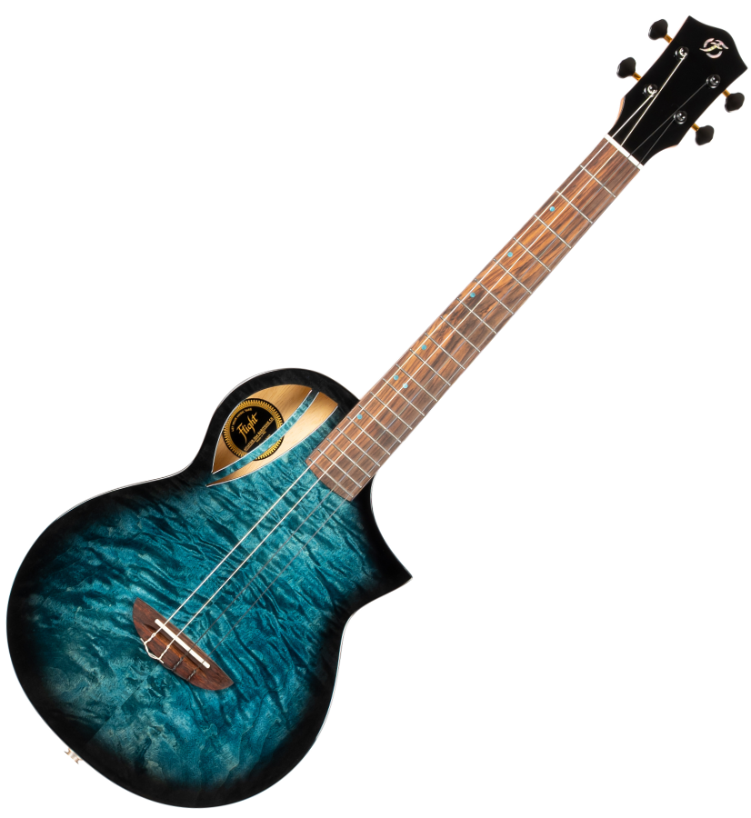 Premium Features: Solid Quilted Maple top, Solid Mango back and sides, Flight Aviator custom design and shape, black and gold machine heads, Offset blue dot position markers, black binding.