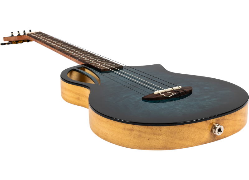 The Flight Aviator QM features sleek black binding and a bold thin design that sets it apart from other ukuleles in the Flight catalog. Its distinctive shape is both visually striking and practical, offering excellent balance and comfort for an effortless playing experience.