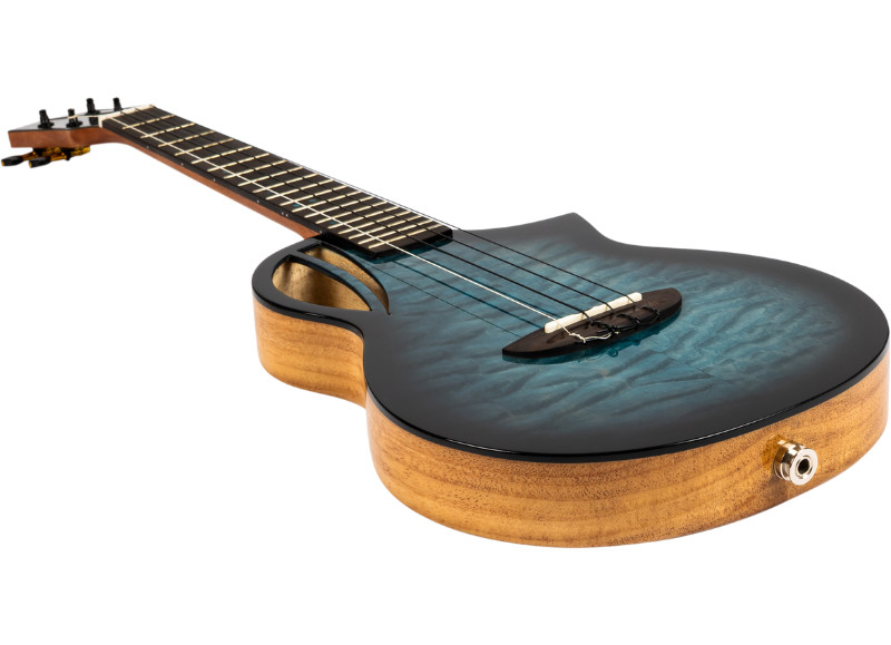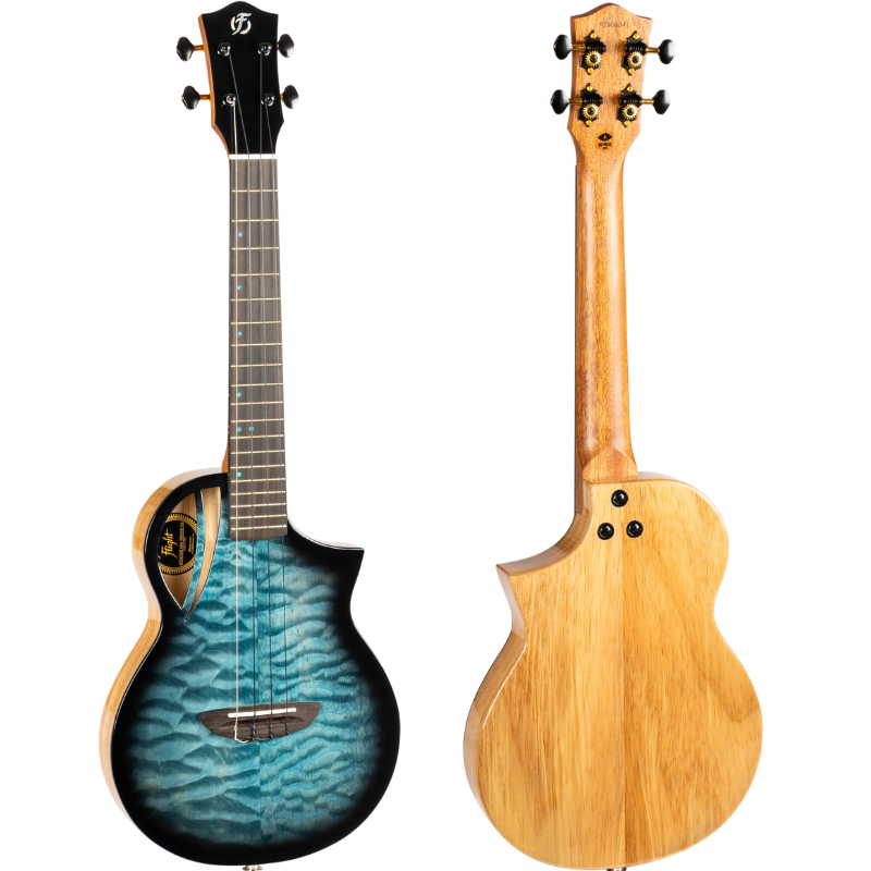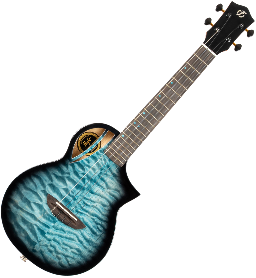 Premium Features: Solid Quilted Maple top, Solid Mango back and sides, Flight Aviator custom design and shape, black and gold machine heads, Offset blue dot position markers, black binding.