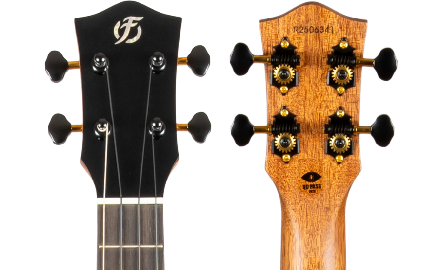 The Flight Aviator QM features a gloss black headstock with the Flight logo, which matches the gloss black scallop and binding of the instrument. The resulting look is both bold and classy.