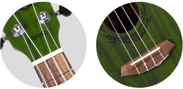 The nut may seem to be a small component, but it plays a critical role in the overall sound of an instrument. The nut and saddle of this ukulele are made from bone (not from plastic), which results in better tone quality.
