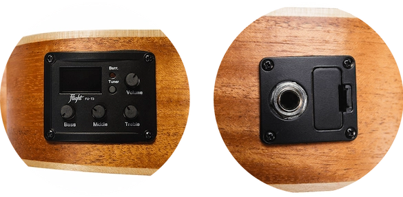 The preamplifier/EQ is a device that lets you connect a ukulele to an amplifier. The preamp, not usually installed on sopranos, features a tuner, saving you the headache of remembering where you left your tuner the night before! Most importantly though, this small device allows you the freedom to plug in wherever and whenever you like, giving your uke the chance to shine on stage!