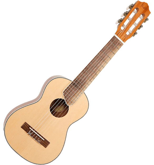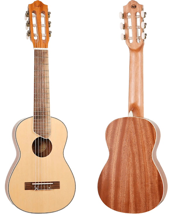 The Flight GUT350 is made of laminate spruce and laminate sapele. The spruce top and sapele sides work together to deliver a sound that is sharp and punchy when soloing in the high register and warm and velvety when you thoughtfully strum by the fireplace on a chilly evening.