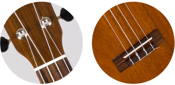 The nut may seem to be a small component, but it plays a critical role in the overall sound of an instrument. The nut and saddle of this ukulele are made from bone (not from plastic), which results in better tone quality.