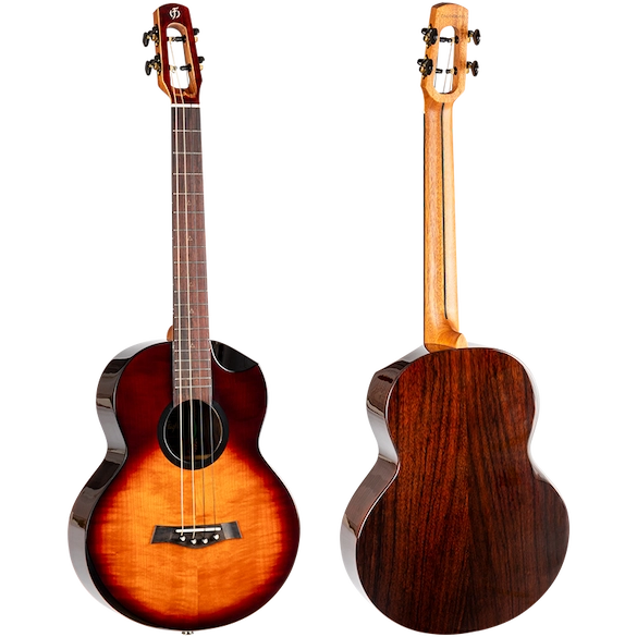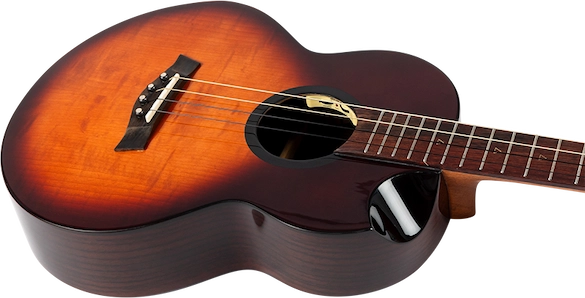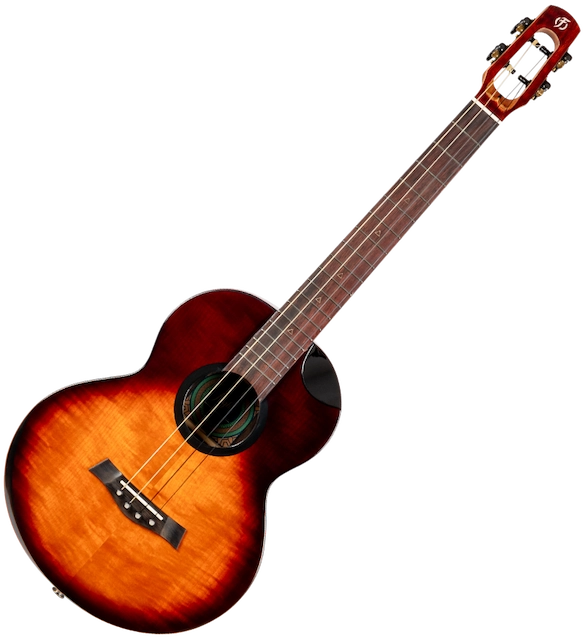 Now for something completely different — the Flight Navigator. While the Navigator shares design cues with other models in the Flight Royal Series, it is set apart by its solid flamed maple top and solid rosewood body–and its amazing sunburst finish. The ukulele offers bright, clear tones with excellent projection, warmth and richness. The result is a balanced sound that is both amazing to see and pleasant to hear. This particular version of the Navigator is offered as a baritone ukulele with linear DGBE tuning, which will add more volume and depth to the sound. Are you looking for a ukulele that will look and sound amazing, inspiring you to play? If so, the Flight Navigator is the instrument for you!