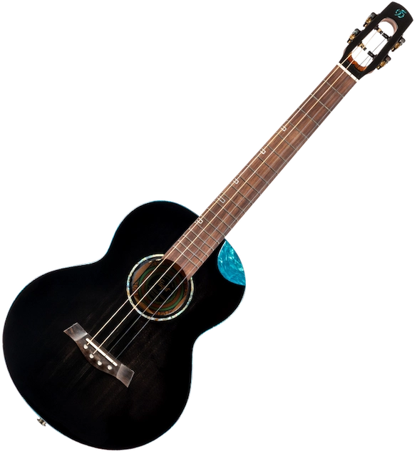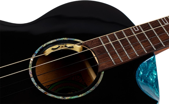 The gorgeous shell rosette and flashy pearloid blue cutaway and binding add bling to this ukulele – even the Flight logo is pearloid blue! The square, off-set fret markers are eye-catching and modern looking. Far from being a retiring wallflower, this ukulele wants to be noticed!