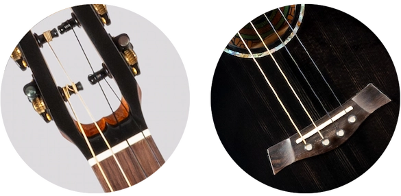 The Nighthawk features a rosewood bridge, as well as a real bone nut and a compensated saddle. Compensated saddles help to properly set the intonation of each string. The Nighthawk includes a pin bridge system, which helps keep the strings properly aligned on the ukulele, as well as to create a break angle over the saddle that transfers vibrations efficiently to the spruce soundboard of the ukulele.