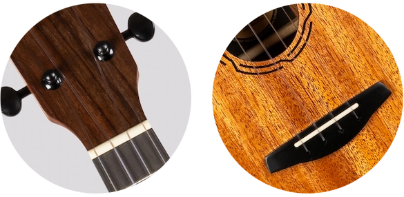 The bridge is where the magic happens! The string-through techwood bridge of the NUC500 provides excellent stability and smooth string vibration transfer, ensuring a balanced tone. The nut and saddle are made from ABS, a durable material that keeps the ukulele sounding great while offering reliable performance.