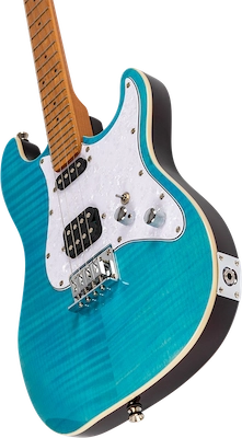 Premium Features: Baritone ukulele, electric ukulele, solid body, metal strings, dual cutaway, flame maple blue gradient top, basswood body, roasted maple neck, bone nut, closed geared tuners, linear headstock, black front position markers, side position markers, white ABS binding, chrome controls, humbucker and single coil pickups, controls for volume and tone, three-way switch, and hardtail fixed bridge.
