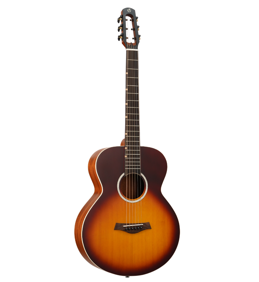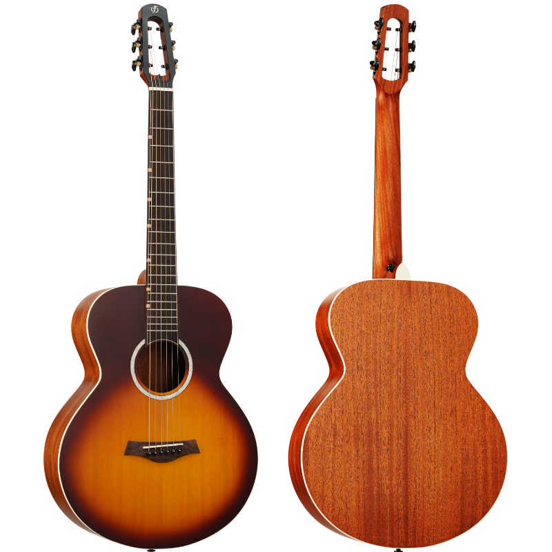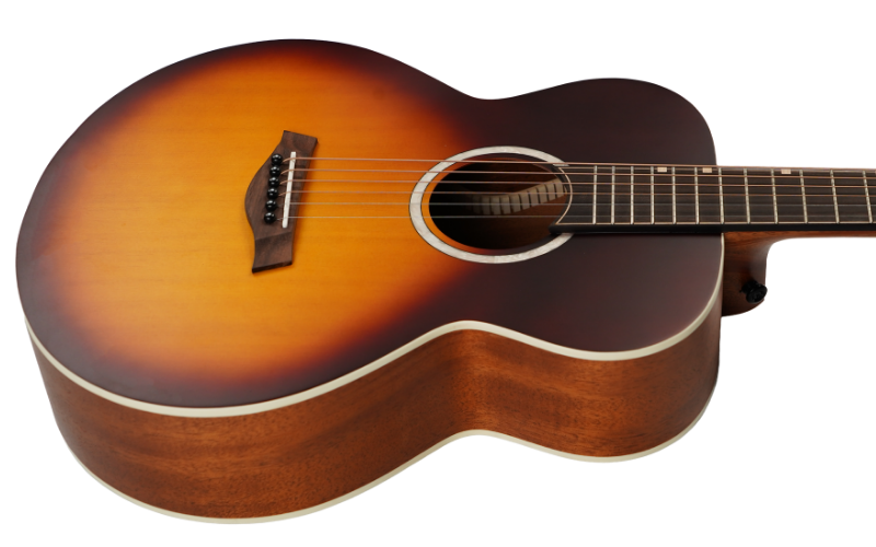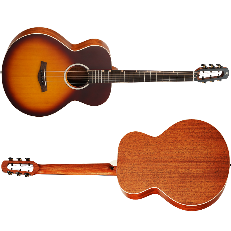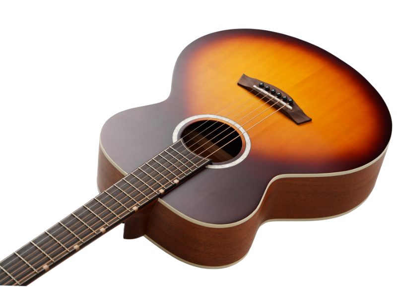 The PIXI TSB features a beautiful sunburst solid spruce top and laminate mahogany back and sides, delivering a clear and balanced tone with plenty of projection and warmth. Spruce provides brightness and articulation, while mahogany adds depth and richness to the mids and lows. The result is a lively and full sound that feels surprisingly powerful for such a compact instrument.