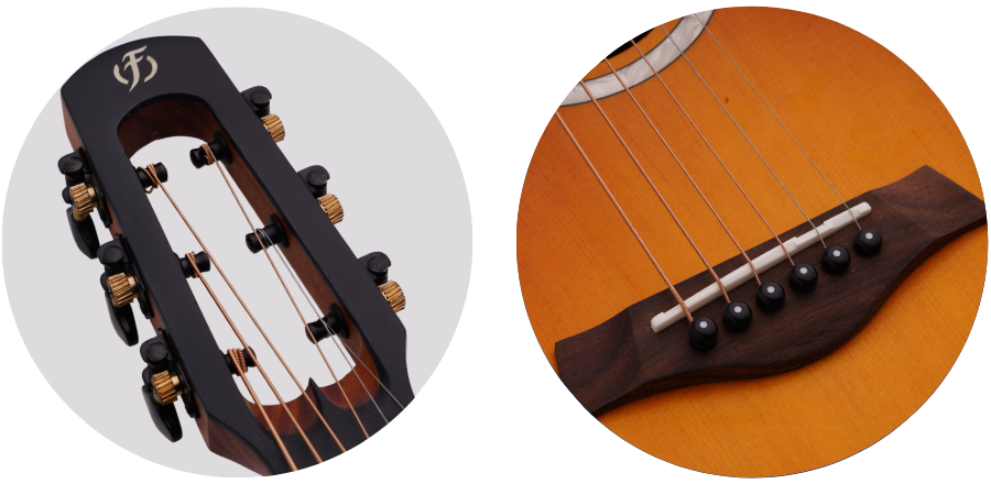 The Flight PIXI features a classic pin bridge system, a design widely used on acoustic guitars for its reliability and strong string anchoring. Bridge pins help secure the strings firmly to the bridge, allowing the top of the guitar to resonate freely and efficiently. This contributes to a clear, responsive tone while also making string changes simple and familiar for guitar players.