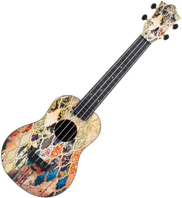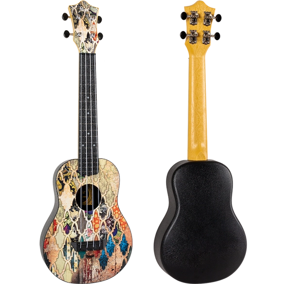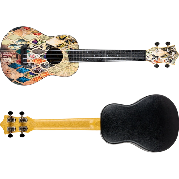 Premium Features: Granada Print, Zero Fret, Wooden Top, Arched back, Open Geared Tuners, ABS Fretboard, Side Dots, Strap Button, Aquila Strings.