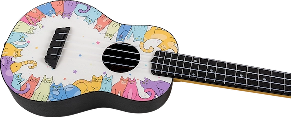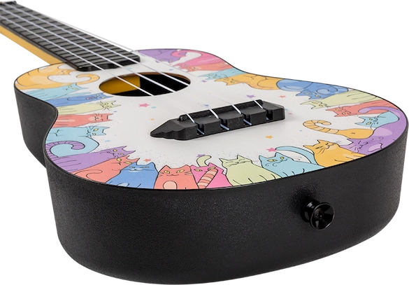 The TUC-KITTY uses laminate linden wood for the sound board. Linden is characterized by a bright sound. The TUC-KITTY features a whimsical print of cartoon cats on the soundboard and headstock.
