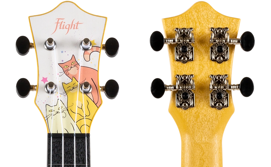All Flight ukuleles feature a carefully-designed headstock fitted with geared tuners that make it easy to keep your ukulele in tune. The headstock veneer is made of linden and matches the soundboard.