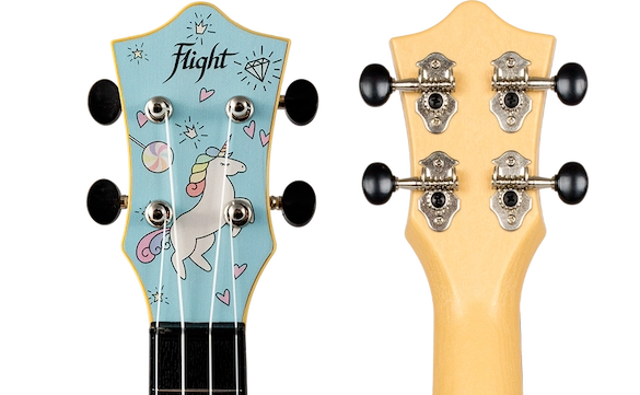 The headstock veneer of the TUS-40 Unicorn matches the design of the soundboard. All Flight ukuleles feature a carefully-designed headstock fitted with geared tuners that will always hold their tuning.