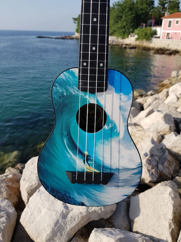 This cool wave ukulele will take you through a wave of emotions and across the seven seas! Its sturdy design makes it the perfect ukulele for travelling and its finish lets you surf on the waves of sound. Bring the sea home with this ukulele!