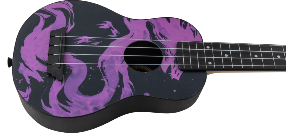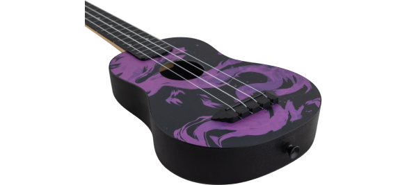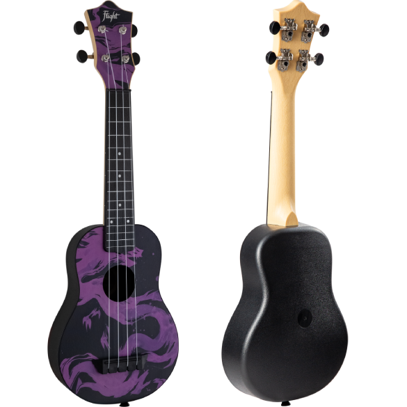 The TUS40 Dragon Travel Ukulele includes a Linden top with an ABS body, neck, fretboard, and bridge. The result is a ukulele with low action that is easy to clean and maintain. Want a ukulele that features a bold, purple dragon design while still being tough, sounding great, and playing beautifully? If so, check out the Flight TUS40 Dragon Ukulele at your local Flight dealer!