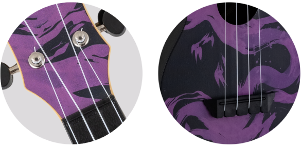 The neck and fingerboard of this ukulele are made from ABS plastic. This is a perfect solution for entry class ukuleles, since it is not prone to any changes in the weather. You will never experience a sharp fret or bent neck on our Travel ukuleles. The neck features a wooden texture, which helps the instrument to feel unlike a plastic ukulele as you play it.