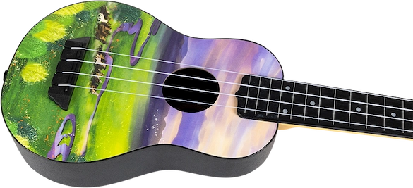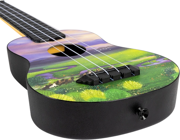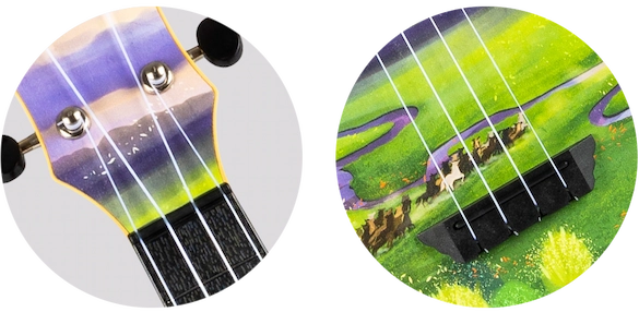 The TUS40 View uses laminate linden wood for the sound board. Linden is characterized by a bright sound. The TUS40 View features a print of a beautiful landscape on the soundboard and headstock.