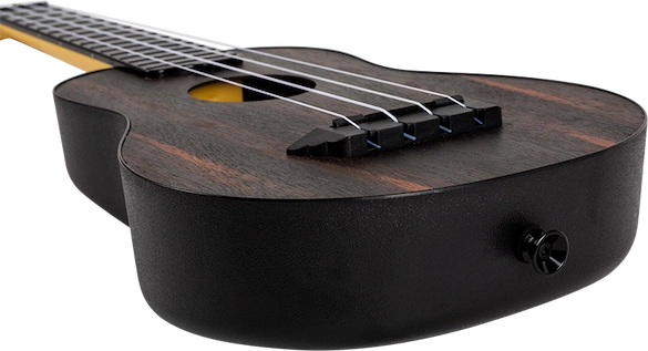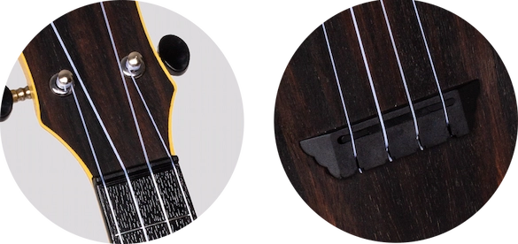 The neck and fingerboard of this ukulele are made from ABS plastic. This is a perfect solution for entry class ukuleles, since it is not prone to any weather changes. You will never experience a sharp fret or bent neck on our Travel ukuleles. The neck features a wooden texture, which helps the instrument to feel unlike a plastic ukulele as you play it.