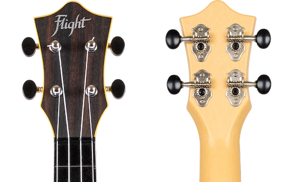 Headstock design is an integral part of our identity. The headstock veneer is made of laminate amara and matches the sound board of the ukulele. All Flight ukuleles feature a carefully-designed headstock fitted with geared tuners that will always hold their tuning (once tuned).