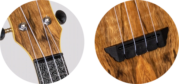 Our travel ukuleles use a zero fret and adjustable saddle, which keeps the string action low and intonation on point. Since a plastic will not react to weather conditions like a wood ukulele, you will should never have to deal with any future saddle adjustments.