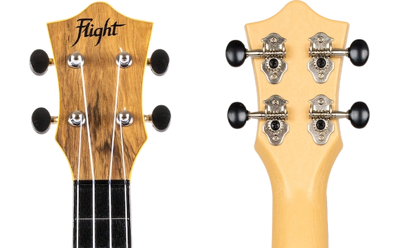 Headstock design is an integral part of our identity. The headstock veneer is made of laminate mango and matches the sound board of the ukulele. All Flight ukuleles feature a carefully-designed headstock fitted with geared tuners that will always hold their tuning (once tuned).