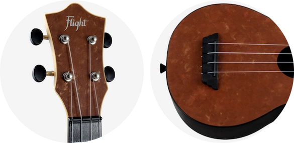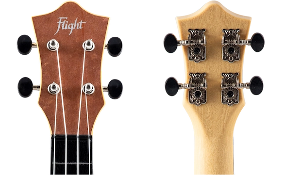 Headstock design is an integral part of our identity. The headstock veneer of TUS65 is made of linden and matches the color of the top. All Flight ukuleles feature a carefully-designed headstock fitted with geared tuners that will always hold their tuning.