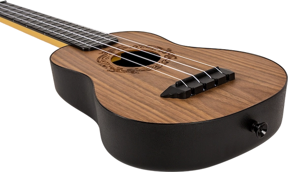 The neck and fingerboard of this ukulele are made from ABS plastic. It is a perfect solution for entry class ukuleles, since it is not prone to any weather changes. You will never get a sharp fret or bent neck in any of our Travel ukuleles. The neck surface imitates the wood pattern, to avoid a feeling of cheap plastic.